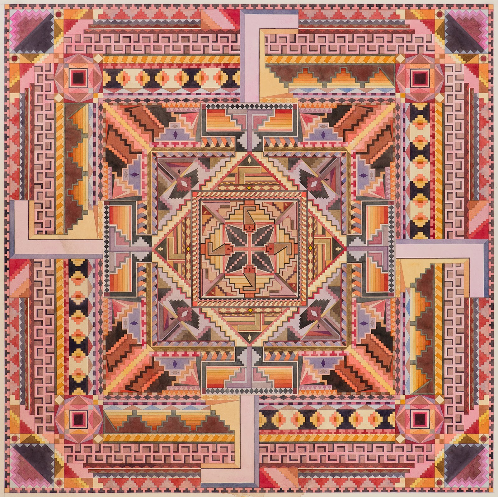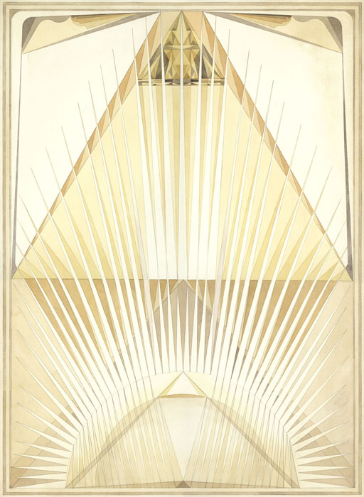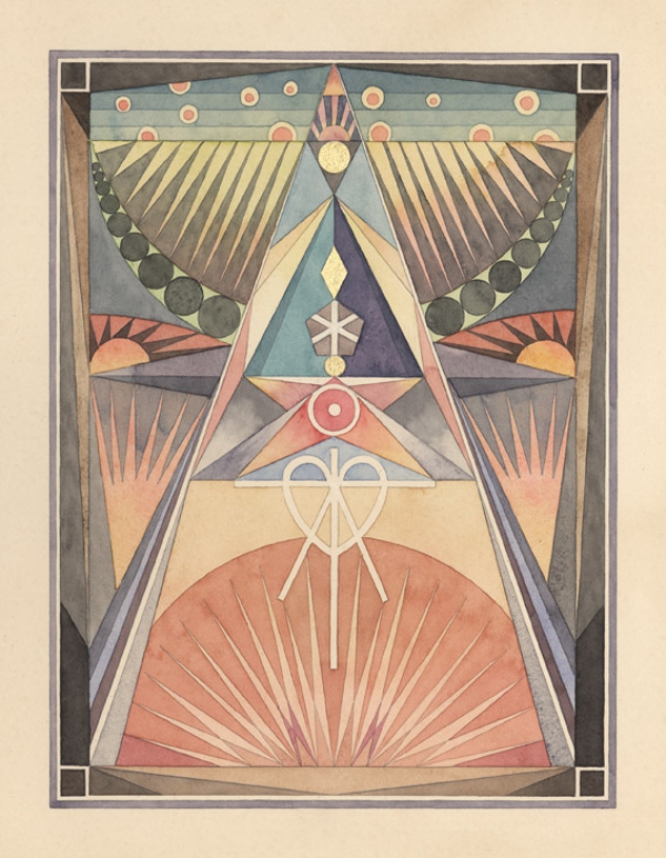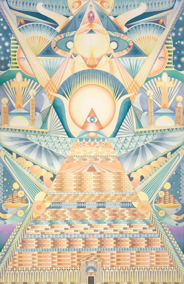Vous aurez donc compris que le travail de l’artiste ne se livre pas de prime abord et nécessite une lecture plus approfondie, celui-ci ayant à priori passé des années à faire la connexion artistique entre le monde de l’occulte et les différentes traditions ésotériques. « Religion, expériences religieuses et la méditation sont d’importantes parties de son travail artistique et de sa vie. Dans nombre de ses travaux, une expression abstraite cosmique se retrouve couplée à une expression très précise et figurative de type architectural, incorporant des éléments visuels complexes inspirés du bouddhisme tibétain et de la religion des indiens natifs d’Amérique ainsi que l’artisanat traditionnel, le tout méticuleusement exécuté à l’aquarelle avec des couleurs minérales et de la feuille d’or. »