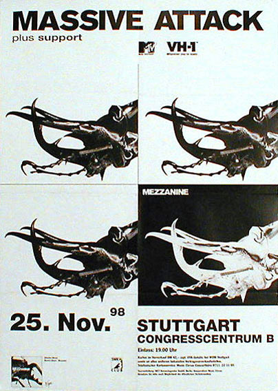 RDN : […] Je crois que j’étais très intéressé à l’époque par l’idée de créer un symbole anti-marque. Et la promo, le marketing de Massive Attack, jusqu’à « Heligoland » a toujours tourné autour de ça, créer un symbole qui, en temps normal, serait considéré comme une identité de marque mais plutôt l’inverse. « Mezzanine » est sorti à une époque la question de l’identité de la marque, les logos étaient remis en question (comme la campagne « No Logo » de Naomi Klein).