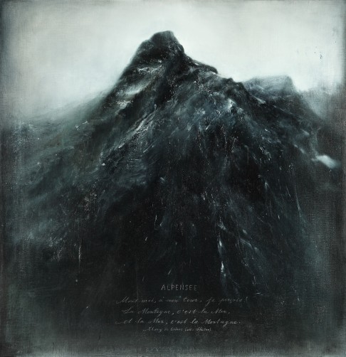Les tableaux choisis sont de grands paysages peints ces dernières années. D’abord, un chemin de campagne, mais celui-ci se transforme peu à peu en mer, en vagues. L’océan et la terre se mélangent dans des tourbillons vert et gris, dans des peintures hors du temps, qui renvoient à toutes les époques et à tous les lieux. Une peinture du « sublime ».