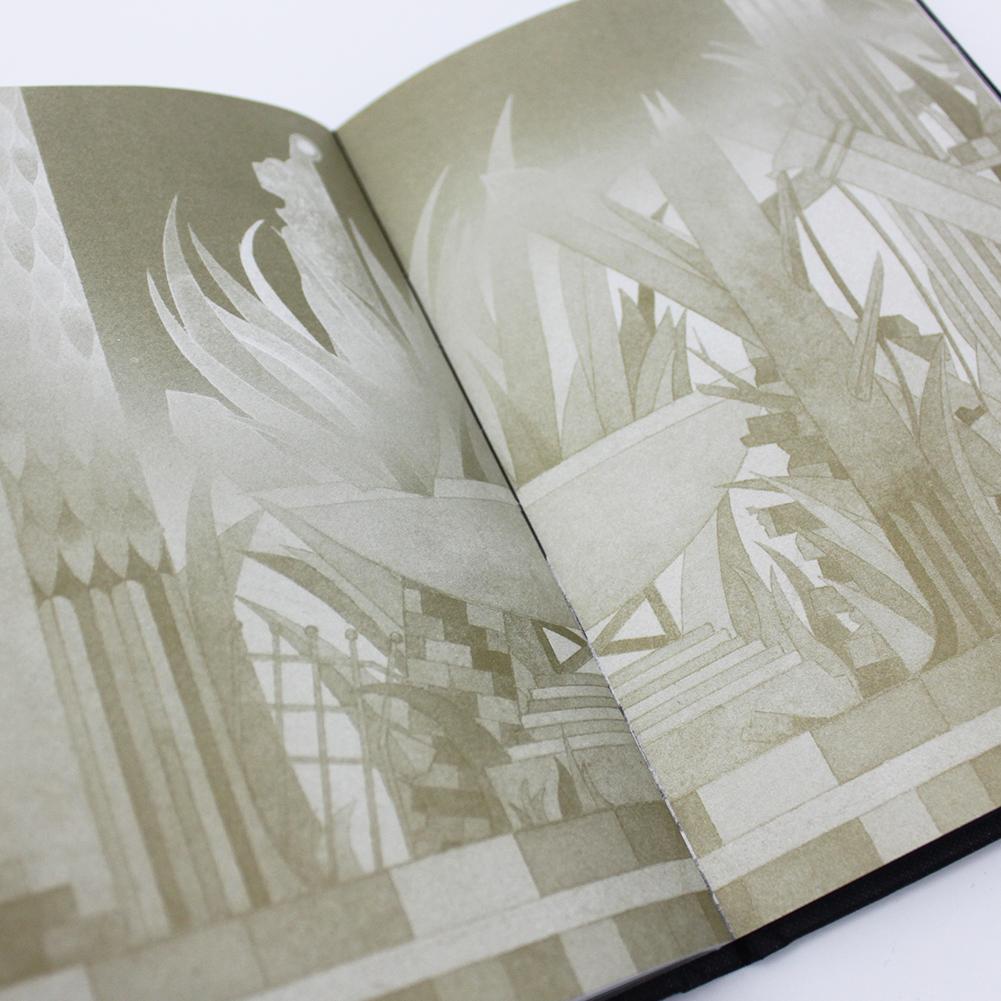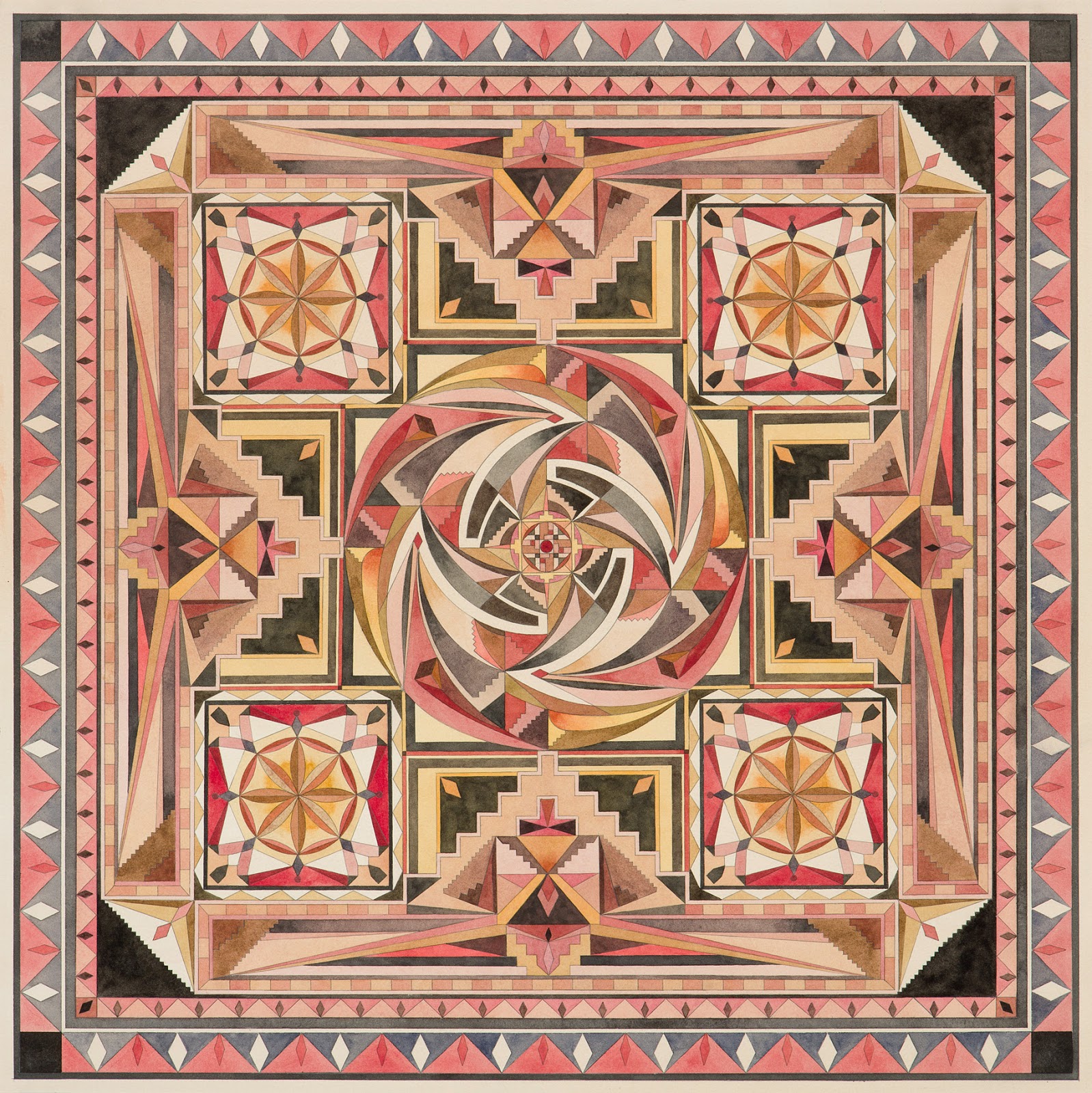 Vous aurez donc compris que le travail de l’artiste ne se livre pas de prime abord et nécessite une lecture plus approfondie, celui-ci ayant à priori passé des années à faire la connexion artistique entre le monde de l’occulte et les différentes traditions ésotériques. « Religion, expériences religieuses et la méditation sont d’importantes parties de son travail artistique et de sa vie. Dans nombre de ses travaux, une expression abstraite cosmique se retrouve couplée à une expression très précise et figurative de type architectural, incorporant des éléments visuels complexes inspirés du bouddhisme tibétain et de la religion des indiens natifs d’Amérique ainsi que l’artisanat traditionnel, le tout méticuleusement exécuté à l’aquarelle avec des couleurs minérales et de la feuille d’or. »